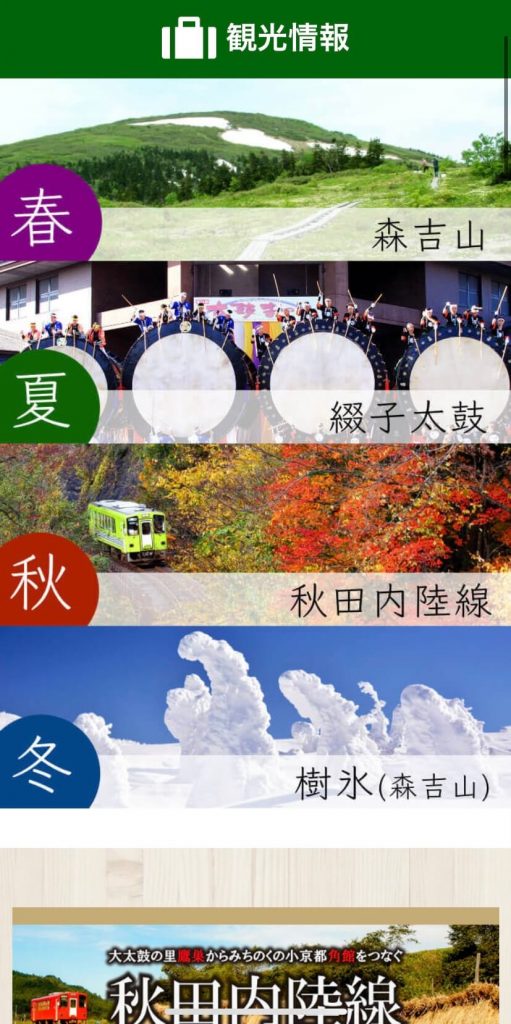 制作事例・実績 北秋田市公式サイト 公開 2020年03月 エリア 秋田 プロジェクト Web制作 カテゴリ ポータルサイト Webサイトを見る Webサイト制作 Web制作について 制作フローについて 関連する実績 教育旅行コンテンツタリフ集 公益財団法人さんりく基金 三陸DMOセンター様 DTP・イラスト制作 冊子・ガイドブック 株式会社安藤醸造 安藤醸造様 Web制作 EC・ショッピングサイト 銀河フーズ株式会社 銀河フーズ株式会社様 Web制作 ポータルサイト